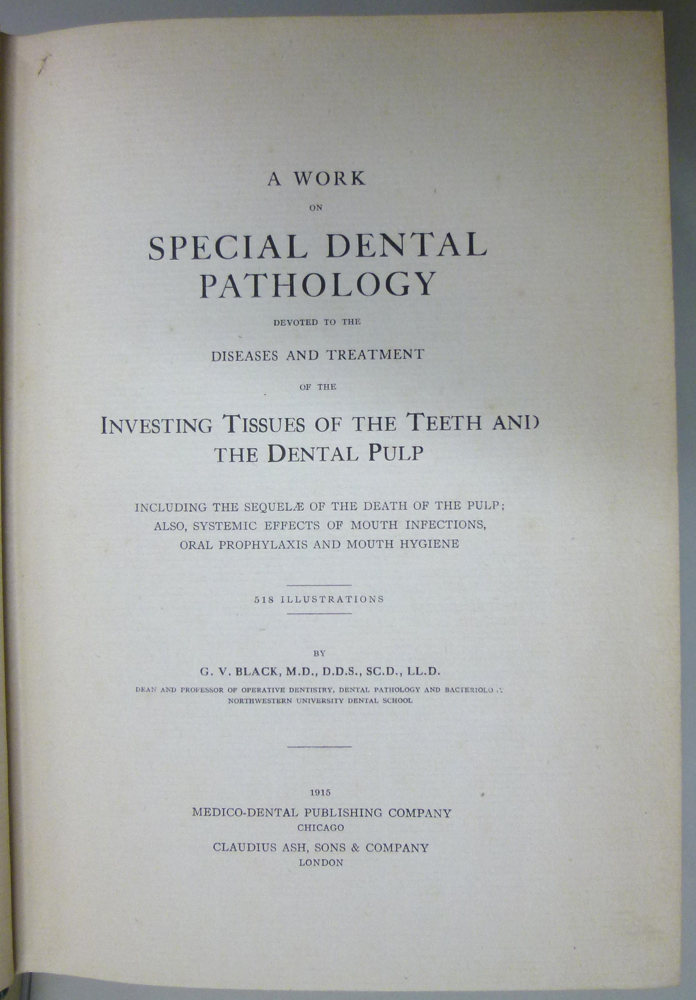 今回の紹介する書は歯髄と歯根膜組織の病理学研究を主として書かれた『A work on special dental pathology devoted to the disease and treatment on the investing tissues of the teeth and the dental pulp』である。本書の大きさは縱×横260×175oで1915年アメリカのシカゴにあるMedico-dental Publishing Companyと英国ロンドンのClaudius Ash, sons & coの二社より同時に出版されている。本文中の説明のために図は全518枚よりなり総475ページよりなっている。本書の主だった記載内容としては歯肉、セメント質、歯周組織、歯根膜、歯槽骨、唾液、歯牙の病理、唾液成分、歯肉の病理、歯周組織の病理、歯髄の病理、歯髄腔、歯根の病理、歯髄の急性・慢性疾患、根尖病巣の症状、急性及び慢性の疾患、診断、口腔診査、口腔衛生等に関する基礎医学分野の内容から治療処置に関する知識や問題点などを中心に歯と口腔周辺の構造、病態状況について懇切丁寧に解説がなされている書である。
